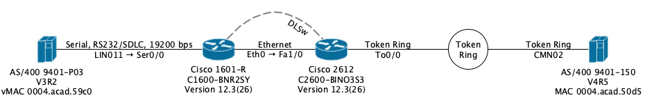 This scenario shows a configuration when connectivity between the two involved AS/400's is limited to TCP/IP, e. g. Ethernet or even WAN/VPN. An additional Router is required, here this is a Cisco 1601-R. This scenario uses DLSw transport for passing traffic between the involved routers. Otherwise, the configuration on Fiona and Nibbler is the same. Hence, this isn't repeated here.